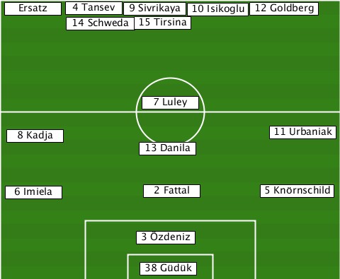 --------4 Tansev----------------- --Ersatz------9 Sivrikaya-10 Isikoglu-12 Goldberg --------14 Schweda-15 Tirsina----- ---------------7 Luley----------- --8 Kadja-------------------11 Urbaniak ---------------13 Danila--------- --6 Imiela------2 Fattal----5 Knörnschild --------------3 Özdeniz---------- ---------------38 Güdük----------