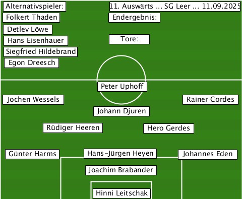 --Alternativspieler:------------- ----------------11. Auswärts ... SG Leer ... 11.09.2025 --Folkert Thaden-Endergebnis:----- --Detlev Löwe-------------------- --Hans Eisenhauer-Tore:----------- --Siegfried Hildebrand----------- --Egon Dreesch------------------- --------------Peter Uphoff------- --Jochen Wessels-----------Rainer Cordes --------------Johann Djuren------ -------Rüdiger Heeren-Hero Gerdes- --Günter Harms-Hans-Jürgen Heyen-Johannes Eden -------------Joachim Brabander--- --------------Hinni Leitschak----