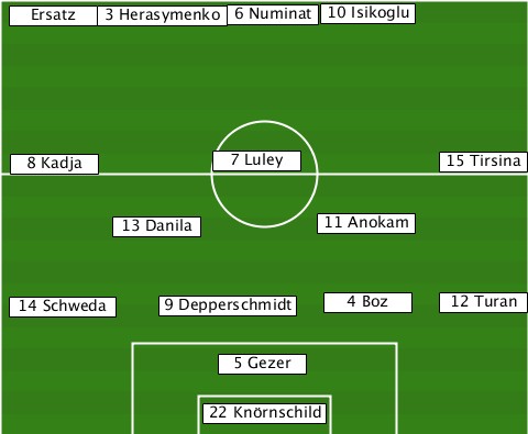---------------------10 Isikoglu- --Ersatz-3 Herasymenko-6 Numinat--- --8 Kadja------7 Luley--------15 Tirsina --------13 Danila-----11 Anokam--- --14 Schweda-9 Depperschmidt-4 Boz-12 Turan ---------------5 Gezer----------- --------------22 Knörnschild-----