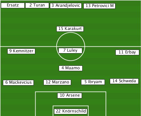 -------2 Turan------------------- --Ersatz------3 Arandjelovic-13 Petrovici M --------------15 Karakurt-------- ---9 Kemnitzer--7 Luley-------11 Erbay ---------------4 Maamo----------- --6 Mackevcius-12 Marzano-5 Ibryam-14 Schweda --------------10 Arsene---------- --------------22 Knörnschild-----
