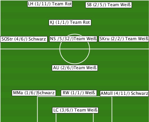 -------LH (1/11/) Team Rot------- --------------------SB (2/5/) Team Weiß ------------KJ (1/1/) Team Rot--- -SOStr (4/6/) Schwarz-NS /5/32/)Team Weiß-SKru (2/2/) Team Weiß -------------AU (2/6/)Team Weiß-- ----MMa (1/6/)Schwarz-RW (1/1/) Weiß-AMüll (4/11/) Schwarz -------------LC (3/6/) Team Weiß-