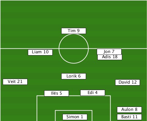 ---------------Tim 9------------- --------Liam 10---------Jon 7----- -----------------------Adis 18--- ---------------Lorik 6----------- --Veit 21-------------------David 12 -----------Ilés 5---Edi 4--------- ---------------------------Aulon 8 ---------------Simon 1------Basti 11