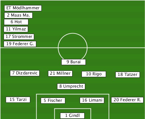 --ET Mödlhammer------------------ --2 Maas Ma.--------------------- --6 Hot-------------------------- --11 Yilmaz---------------------- --17 Strommer-------------------- --19 Federer G.------------------ ---------------9 Burai----------- ----7 Dizdarevic-21 Millner-10 Rigo-18 Tatzer --------------8 Umprecht--------- ---15 Tarzi-5 Fischer-16 Limani-20 Federer R. ---------------1 Gindl-----------