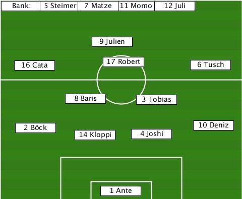 --Bank:-------------------------- -------5 Steimer-7 Matze-11 Momo-12 Juli --------------9 Julien----------- ---16 Cata------17 Robert----6 Tusch ----------8 Baris---3 Tobias------ ---2 Böck---14 Kloppi-4 Joshi-10 Deniz ---------------1 Ante------------