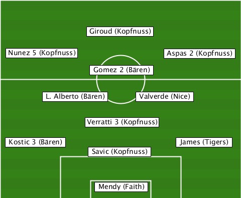 -------------Giroud (Kopfnuss)--- --Nunez 5 (Kopfnuss)----Aspas 2 (Kopfnuss) -------------Gomez 2 (Bären)----- -------L. Alberto (Bären)-Valverde (Nice) -------------Verratti 3 (Kopfnuss) --Kostic 3 (Bären)--------James (Tigers) -------------Savic (Kopfnuss)---- --------------Mendy (Faith)------