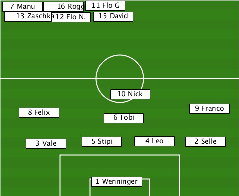 -------------11 Flo G------------ --7 Manu-16 Rogg------------------ --13 Zaschka-12 Flo N.-15 David---- ----------------10 Nick---------- ----8 Felix-----6 Tobi-------9 Franco -----3 Vale--5 Stipi-4 Leo---2 Selle --------------1 Wenninger--------