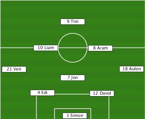 ---------------9 Tim------------- ---------10 Liam------8 Aram------ --21 Veit--------------------18 Aulon ---------------7 Jon------------- --------4 Edi---------12 David---- ---------------1 Simon-----------