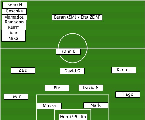--Keno H------------------------- --Geschke------------------------ --Mamadou-----Beran (ZM) / Efe( ZDM) --Ramadan------------------------ --Keirm-------------------------- --Lionel------------------------- --Mika--------------------------- --------------Yannik------------- ----Zaid--------David G-----Keno L- -----------Efe------David N------- --Levin---------------------Tiago- ----------Mussa------Mark--------- --------------Henri/Phillip------