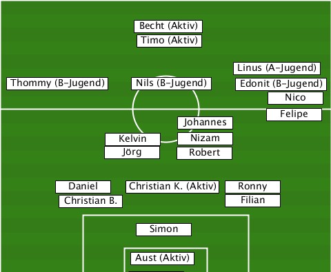 --------------Becht (Aktiv)------ ---------------Timo (Aktiv)------ ------------------------Linus (A-Jugend) --Thommy (B-Jugend)-Nils (B-Jugend)-Edonit (B-Jugend) ---------------------------Nico-- -------------------Johannes-Felipe ------------Kelvin--Nizam--------- ------------Jörg----Robert-------- -------Daniel--Christian K. (Aktiv)-Ronny -------Christian B.-----Filian---- ---------------Simon------------- --------------Aust (Aktiv)-------