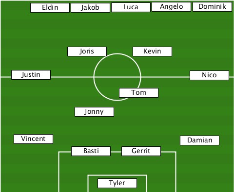 ----------------------Angelo----- ------Eldin-Jakob--Luca--------Dominik -----------Joris-----Kevin-------- ---Justin-------------------Nico-- ------------------Tom------------ ------------Jonny---------------- ---Vincent-----------------Damian- -----------Basti---Gerrit--------- ---------------Tyler-------------