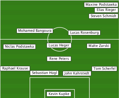------------------------Maxine Podstawka ---------------------------Elias Rieger -------------------------Steven Schmidt ------Mohamed Bangoura-Lucas Rosenburg --Niclas Podstawka-Lucas Heger-Malte Zarski --------------Rene Peters-------- -Raphael Krause------------Tom Scherfel ----------Sebastian Hügl-John Kahrstedt --------------Kevin Kupke--------