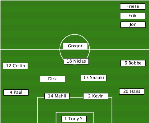 ---------------------------Friese ---------------------------Erik-- ---------------------------Jon--- ---------------Gregor------------ --12 Collin-----18 Niclas----6 Bobbe ----------Dirk------13 Snauki----- --4 Paul----14 Mehli-2 Kevin--20 Hans ---------------1 Tony S.---------