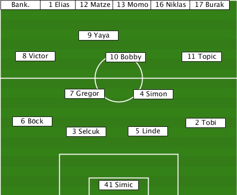 -------1 Elias------------------- --Bank.------12 Matze-13 Momo-16 Niklas-17 Burak ------------9 Yaya--------------- ----8 Victor-----10 Bobby---11 Topic ----------7 Gregor--4 Simon------- ---6 Böck-------------------2 Tobi ----------3 Selcuk--5 Linde------- ---------------41 Simic----------