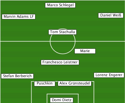 -------------Marco Schlegel------ --Marvin Adams LF-----------Daniel Weiß --------------Tom Stachulla------ ---------------------Marie------- ------------Franchesco Leistner-- --Stefan Berberich--------Lorenz Engerer ----------Puschkin-Alex Grünsteudel --------------Domi Dietz---------