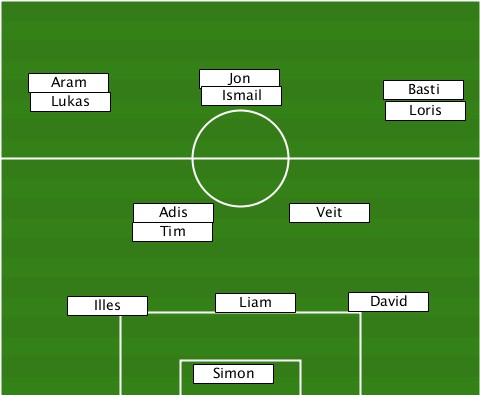 ---------------Jon--------------- ---Aram-Lukas----Ismail-------Basti-Loris ----------Adis--------Veit-------- ----------Tim-------------------- ------Illés------Liam------David--- --------------Simon--------------