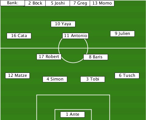 --Bank:-------------------------- -------2 Böck-5 Joshi-7 Greg-13 Momo -------------10 Yaya------------- ---16 Cata------11 Antonio--9 Julien ---------17 Robert---8 Baris------ ---12 Matze-4 Simon--3 Tobi---6 Tusch ---------------1 Ante------------