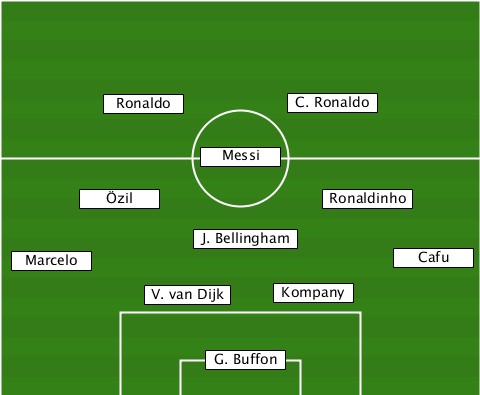 ---------------------C. Ronaldo-- --------Ronaldo------------------ ---------------Messi------------- -------Özil-------------Ronaldinho --------------J. Bellingham------ --Marcelo--------------------Cafu- -----------V. van Dijk-Kompany---- ---------------G. Buffon---------