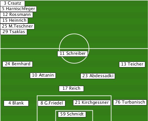 -3 Craatz------------------------ -5 Harnischfeger----------------- -12 Rossmann--------------------- -15 Heinrich--------------------- -25 M.Teschner------------------- --29 Tsaklas--------------------- --------------11 Schreiber------- --24 Bernhard---------------13 Teicher --------10 Attanin--23 Abdessadki- --------------17 Reich----------- --4 Blank--8 G.Friedel-21 Kirchgessner-76 Turbanisch --------------59 Schmidt---------
