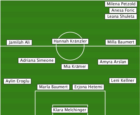 -------------------------Milena Petzold --------------------------Anesa Foric -------------------------Leana Shuleta ---Jamilah Ali-Hannah Kränzler-Milla Baumert ------Adriana Simeone----Amyra Arslan ---------------Mia Krämer-------- --Aylin Eroglu-------------Leni Kellner ----------Marla Baumert-Erjona Hetemi -------------Klara Melchinger----