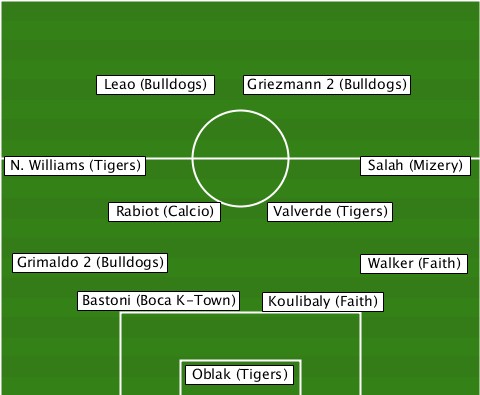 ------------------Griezmann 2 (Bulldogs) --------Leao (Bulldogs)---------- --N. Williams (Tigers)----Salah (Mizery) ---------Rabiot (Calcio)-Valverde (Tigers) --Grimaldo 2 (Bulldogs)---Walker (Faith) -------Bastoni (Boca K-Town)-Koulibaly (Faith) --------------Oblak (Tigers)-----