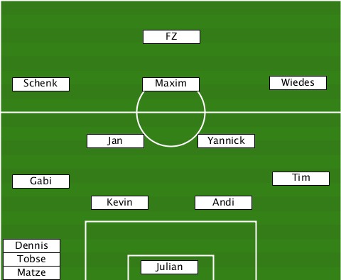 ---------------FZ---------------- ---Schenk-------Maxim--------Wiedes ----------Jan--------Yannick------ ---Gabi---------------------Tim--- ----------Kevin------Andi--------- --Dennis------------------------- --Tobse-Matze----Julian------------