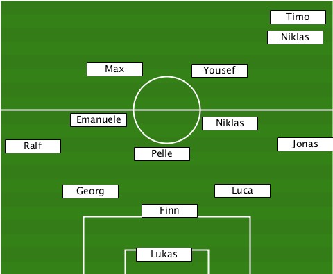 ---------------------------Timo-- ---------------------------Niklas ----------Max--------Yousef------- --------Emanuele------Niklas------ --Ralf---------Pelle----------Jonas -------Georg-----------Luca------- ---------------Finn-------------- ---------------Lukas-------------