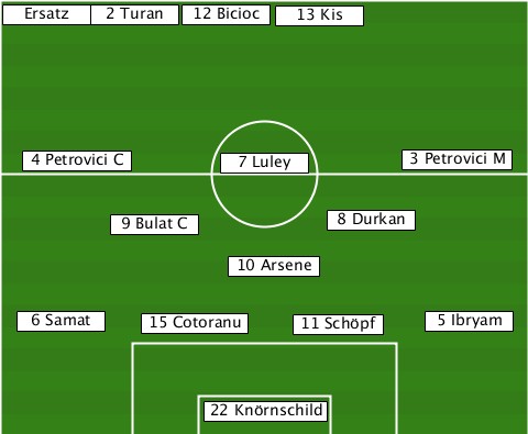 --Ersatz------------------------- -------2 Turan-12 Bicioc-13 Kis---- ---4 Petrovici C-7 Luley----3 Petrovici M --------9 Bulat C-----8 Durkan---- ---------------10 Arsene--------- --6 Samat--15 Cotoranu-11 Schöpf-5 Ibryam --------------22 Knörnschild-----