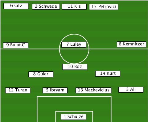 --Ersatz------------------------- --------2 Schweda-11 Kis-15 Petrovici --9 Bulat C-----7 Luley------6 Kemnitzer ---------------10 Boz------------ --------8 Güler--------14 Kurt---- ---12 Turan-5 Ibryam-13 Mackevicius-3 Ali ---------------1 Schulze---------