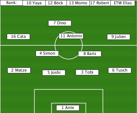 -Bank:--------------------------- -------10 Yaya-12 Böck-13 Momo-17 Robert-ETW Elias -------------7 Dino-------------- ---16 Cata------11 Antonio--9 Julien ----------4 Simon----8 Baris------ ---2 Matze--5 Joshi--3 Tobi---6 Tusch ---------------1 Ante------------