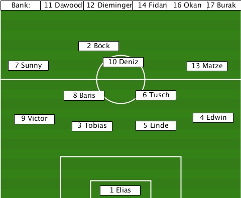 ------------------------16 Okan-- --Bank:-11 Dawood-12 Dieminger-14 Fidan-17 Burak ------------2 Böck--------------- ---7 Sunny------10 Deniz----13 Matze ----------8 Baris---6 Tusch------- ---9 Victor-3 Tobias-5 Linde--4 Edwin ---------------1 Elias-----------