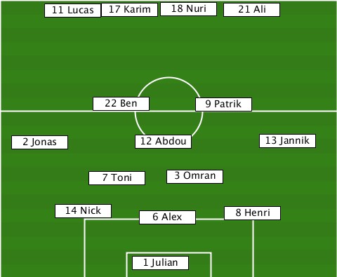 -----------------18 Nuri--------- ------11 Lucas-17 Karim--21 Ali---- ----------22 Ben-----9 Patrik----- ---2 Jonas-----12 Abdou-----13 Jannik ----------7 Toni--3 Omran--------- -------14 Nick--6 Alex---8 Henri--- --------------1 Julian-----------