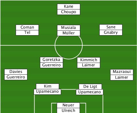 ---------------Kane-------------- ---------------Choupo------------ -----Coman------Musiala----Sane---- -----Tel--------Müller-----Gnabry-- -----------Goretzka-Kimmich------- -----------Guerreiro-Laimer------- --Davies--------------------Mazraoui --Guerreiro-----------------Laimer ----------Kim--------De Ligt------ ---------Upamecano--Upamecano----- ---------------Neuer------------- ---------------Ulreich-----------