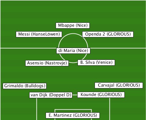 --------------Mbappe (Nice)------ -----Messi (HanseLöwen)-Openda 2 (GLORIOUS) --------------di Maria (Nice)---- -------Asensio (Nastrovje)-B. Silva (Venice) --Grimaldo (Bulldogs)--Carvajal (GLORIOUS) --------van Dijk (Doppel D)-Kounde (GLORIOUS) -----------E. Martinez (GLORIOUS)
