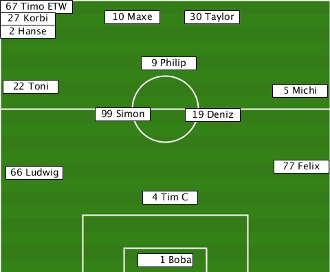 -67 Timo ETW--------------------- -27 Korbi----10 Maxe-30 Taylor----- -2 Hanse------------------------- ---------------9 Philip---------- --22 Toni--------------------5 Michi -----------99 Simon-19 Deniz------ --66 Ludwig------------------77 Felix ---------------4 Tim C----------- ---------------1 Boba------------