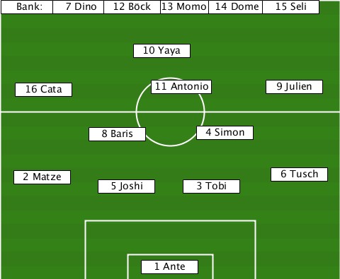 --------------------------15 Seli --Bank:-7 Dino-12 Böck-13 Momo-14 Dome --------------10 Yaya------------ ---16 Cata-------11 Antonio-9 Julien ----------8 Baris----4 Simon------ ---2 Matze--5 Joshi--3 Tobi---6 Tusch ---------------1 Ante------------