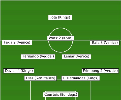 --------------Jota (Kings)------- --------------Wirtz 2 (Korn)----- --Fekir 2 (Venice)--------Rafa 3 (Venice) -------Fernando (Veddel)-Lemar (Venice) --Davies 4 (Kings)------Frimpong 2 (Veddel) --------Dias (Gen Italien)-L. Hernandez (Kings) -------------Courtois (Bulldogs)-