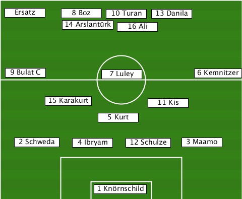 --Ersatz------------------------- ----------8 Boz-10 Turan-13 Danila- ----------14 Arslantürk-16 Ali---- --9 Bulat C-----7 Luley------6 Kemnitzer -------15 Karakurt----11 Kis------ --------------5 Kurt------------- ---2 Schweda-4 Ibryam-12 Schulze-3 Maamo --------------1 Knörnschild------