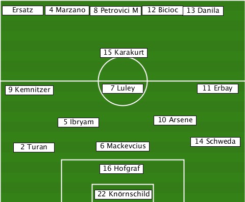 --Ersatz------------------------- -------4 Marzano-8 Petrovici M-12 Bicioc-13 Danila ---------------15 Karakurt------- --9 Kemnitzer---7 Luley------11 Erbay ---------5 Ibryam------10 Arsene-- ---2 Turan-----6 Mackevcius-14 Schweda --------------16 Hofgraf--------- --------------22 Knörnschild-----