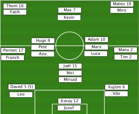 ---------------------------Mateo 19 --Thom 16-Fatih--Max 7--------Miro-- ---------------Kevin------------- ---------Hugo 9-------Adam 10----- --Permet 17-Franch-Pete-Azo-Luca-Marx-Manu 2-Tim 2 ---------------Joël 15----------- ---------------Nici-------------- ---------------Mirsad------------ ---Daved 5 (5)-------------Kujtim 6 ----Leo--------------------Vibi--- ---------------Koray 12---------- ---------------Jusuf-------------