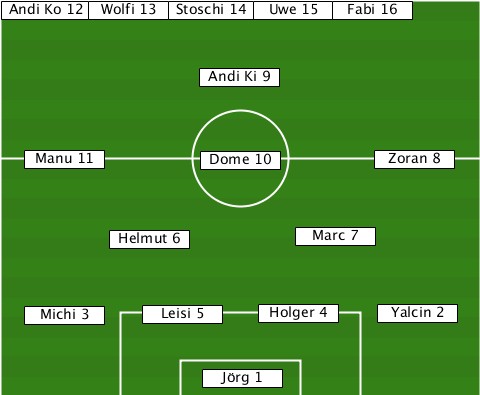 --Andi Ko 12--------------------- -------Wolfi 13-Stoschi 14-Uwe 15-Fabi 16 ---------------Andi Ki 9--------- ---Manu 11------Dome 10-----Zoran 8 ---------Helmut 6-----Marc 7------ ---Michi 3--Leisi 5--Holger 4-Yalcin 2 ---------------Jörg 1------------