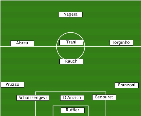 ---------------Nagera------------ ----Abreu-------Trani-------Jorginho ---------------Rauch------------- --Pruzzo---------------------Franzoni -----Schoissengeyr-D'Anzico-Bedouret ---------------Ruffier-----------