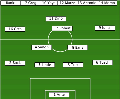 -------7 Greg-------------------- --Bank:------10 Yaya-12 Matze-13 Antonio-14 Momo --------------11 Dino------------ ---16 Cata------17 Robert----9 Julien ----------4 Simon---8 Baris------- ---2 Böck---5 Linde-3 Tobi---6 Tusch ---------------1 Ante------------