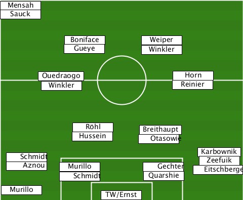 -Mensah-------------------------- -Sauck--------------------------- ----------Boniface---Weiper------- ----------Gueye------Winkler------ ------Ouedraogo----------Horn----- -------Winkler-----------Reinier-- -----------Hussein-Röhl-Otasowie-Breithaupt --Schmidt-Aznou-Murillo-Schmidt-Gechter-Quarshie-Eitschberger-Karbownik-Zeefuik --Murillo-------TW/Ernst----------