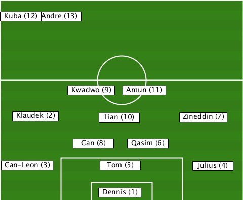 -Kuba (12)----------------------- ------Andre (13)----------------- ----------Kwadwo (9)-Amun (11)---- ---Klaudek (2)-Lian (10)---Zineddin (7) -----------Can (8)-Qasim (6)------ --Can-Leon (3)--Tom (5)------Julius (4) --------------Dennis (1)---------