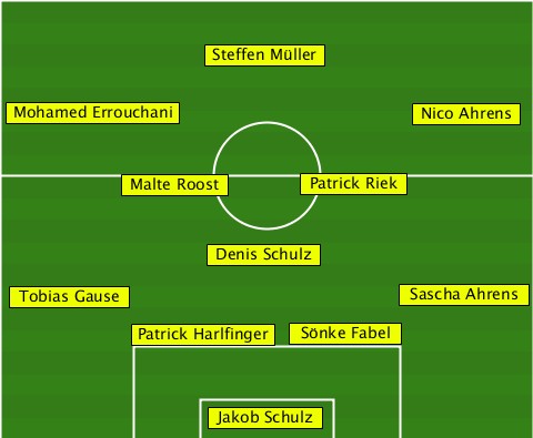 --------------Steffen Müller----- --Mohamed Errouchani-------Nico Ahrens ---------Malte Roost-Patrick Riek- --------------Denis Schulz------- --Tobias Gause------------Sascha Ahrens ---------Patrick Harlfinger-Sönke Fabel --------------Jakob Schulz-------