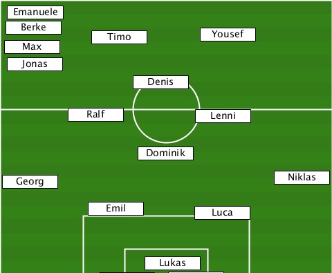 --Emanuele----------------------- --Max-Berke-Timo--------Yousef------ --Jonas-------------------------- --------------Denis-------------- --------Ralf---------Lenni-------- ---------------Dominik----------- --Georg----------------------Niklas ----------Emil-------Luca--------- ---------------Lukas-------------