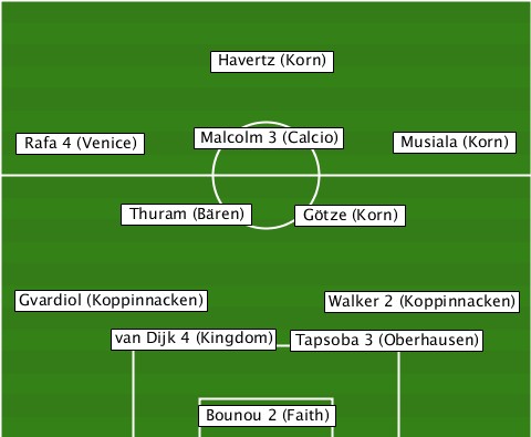 --------------Havertz (Korn)----- --Rafa 4 (Venice)-Malcolm 3 (Calcio)-Musiala (Korn) ---------Thuram (Bären)-Götze (Korn) --Gvardiol (Koppinnacken)-Walker 2 (Koppinnacken) --------van Dijk 4 (Kingdom)-Tapsoba 3 (Oberhausen) -------------Bounou 2 (Faith)----