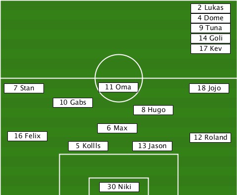 ---------------------------2 Lukas ---------------------------4 Dome ---------------------------9 Tuna ---------------------------14 Goli ---------------------------17 Kev --7 Stan--------11 Oma-------18 Jojo ---------10 Gabs----------------- -------------------8 Hugo-------- ---------------6 Max------------- --16 Felix------------------12 Roland -----------5 Kollls-13 Jason------ ---------------30 Niki-----------