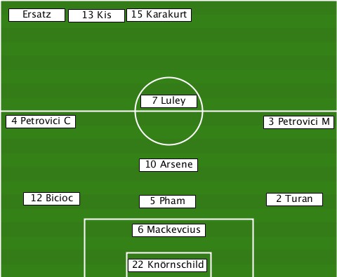 --Ersatz------------------------- --------13 Kis-15 Karakurt-------- ---------------7 Luley----------- --4 Petrovici C------------3 Petrovici M ---------------10 Arsene--------- ----12 Bicioc---5 Pham-------2 Turan --------------6 Mackevcius------- --------------22 Knörnschild-----