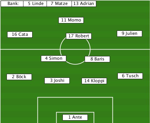 -----------------13 Adrian------- --Bank:-5 Linde-7 Matze------------ --------------11 Momo------------ ---16 Cata-------17 Robert--9 Julien ----------4 Simon----8 Baris------ ---2 Böck---3 Joshi--14 Kloppi-6 Tusch ---------------1 Ante------------